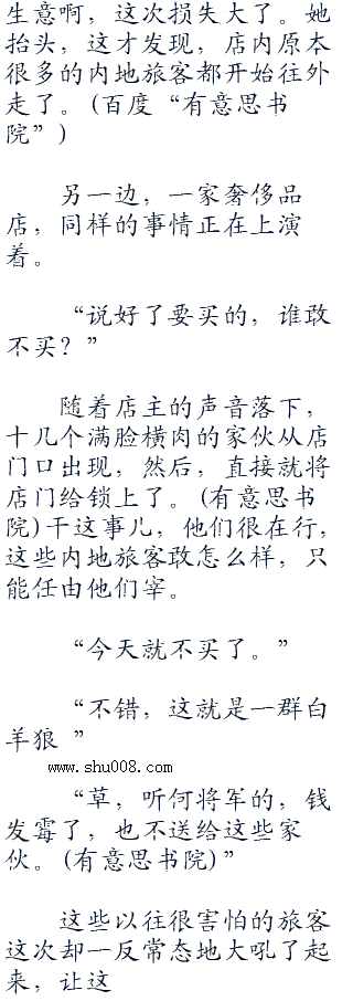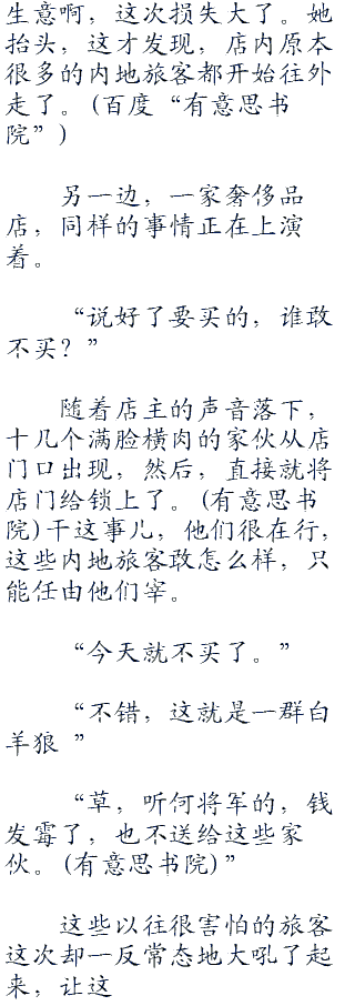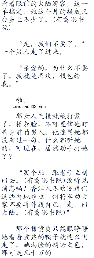而且,那些港灿分子所说的什么素质问题,在何振中看来就更加可笑了,少数的人绝对不能代表全部,香江人难道就没有坏的了?得了吧,而且,抵制大陆到香江自由行,这些家伙抵制自己人也不抵制东南亚和非洲诸国的人?那些游客的行为品行,至少不比内地客优胜,内地游客纵有一万个缺点,至少也是在香江花钱的,但是许多穷国的游客,在香江延期居留,采取非法手段请求留下,这些游客的平均素质肯定比内地客差得多,但对于他们,甚至不用签证,香江也可以让他们自由进出,反而对内地游客设限,必须申请双程证,才能来香江,这让何振中都有些怀疑,到底谁他吗才是自己一家人了。手机阅读更方便m..