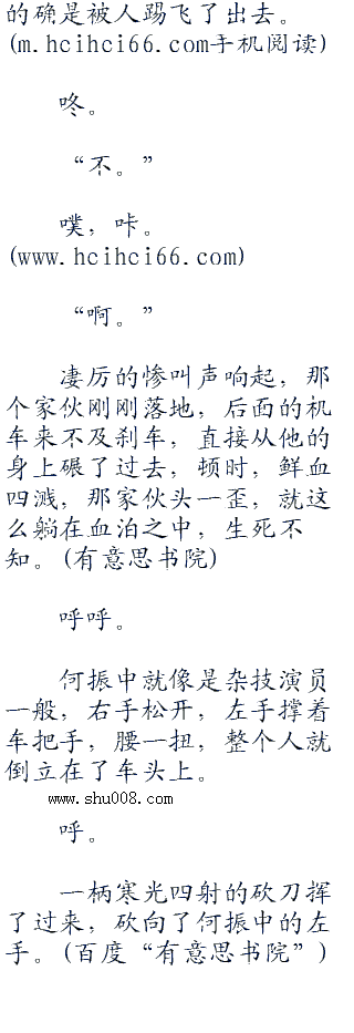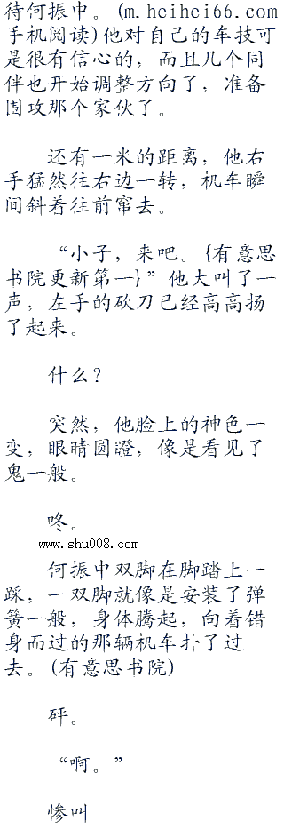 他嘴里大骂了一句,眼中闪过了一丝害怕,右手猛力一扭油门,机车发出了巨大的轰鸣声,不断加速。他准备再近些就和何振中错开,用砍刀好好招