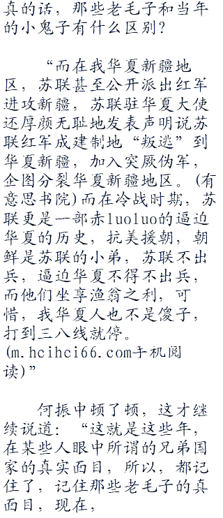 “或许,你们有些人会疑惑,前些年,华夏和俄罗斯关系不是很好吗?”何振中环视了一眼众人,这才继续说道:“这都是表现,一山不容二虎的道理,那些老毛子比我们更清楚,所以,他们一直都在不断地试图肢解,灭掉我华夏。”