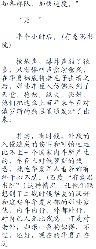何振中没有说话,只是看向了远处,能够看见不少就那么躺在地上的俄罗斯女人,衣服都被扒光了,不少车臣人正在大笑着,趴在那些女人身上耸动着。甚至,他还看见不少小女孩儿的尸体,不<div class="divimage"><div class="divimage"><div class="divimage"><div class="divimage"><div class="divimage">