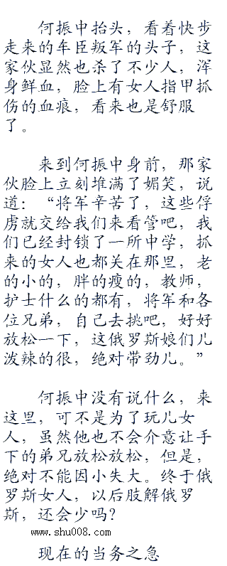 路边,两个车臣人按住了一个俄罗斯的女人,枪已经扔到了一边,四只大手正在不断地撕扯着,而那个女人的脸上泪流不止,满是绝望之色,挣扎已经没有半点儿用处了。