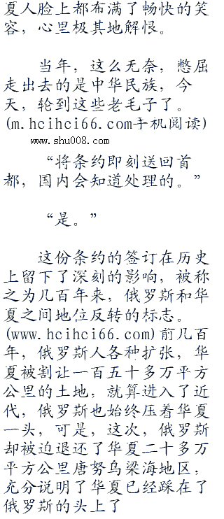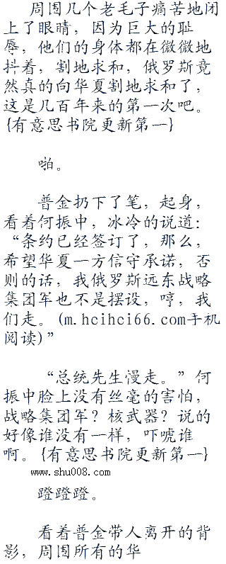 何振中的脸色没有丝毫的改变,屈辱吗?不甘吗?愤怒吗?哼,这些滋味儿,华夏已经尝了几十年,乃至上百年的时间了,也该这些老毛子好好体会一下了。