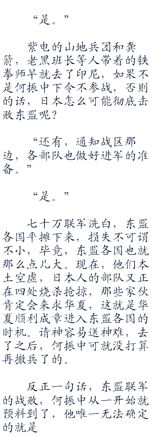 “是的,根据司徒将军的描述,在轰炸之后,日本并没有攻击马奇诺防线,他们的大部队而是在其海军舰队协助下,直接出现在了槟城,宋卡一线,而东盟的军队刚刚被抽调支援马奇诺一线,所以,日军几乎没有遭遇到多大的抵抗,日军从槟城登陆。。w ..co m”