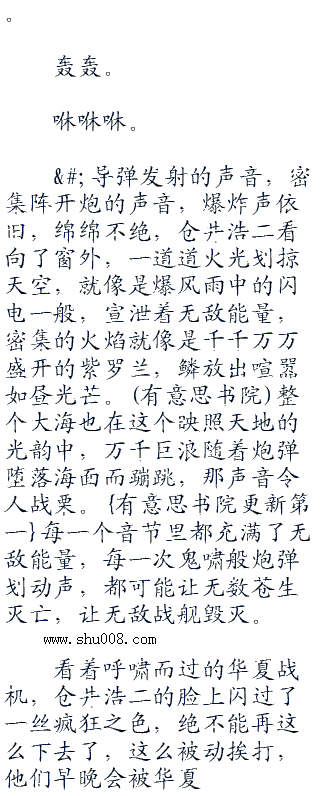 炮在吼,弹在叫,大海在愤怒地咆哮着,在血与火的交织中,在这种辉煌的战斗中,华夏海军的飞行员们笑看生死,在此碰撞出民族的魂魄与气慨,演义出炎黄子孙的不屈精神。