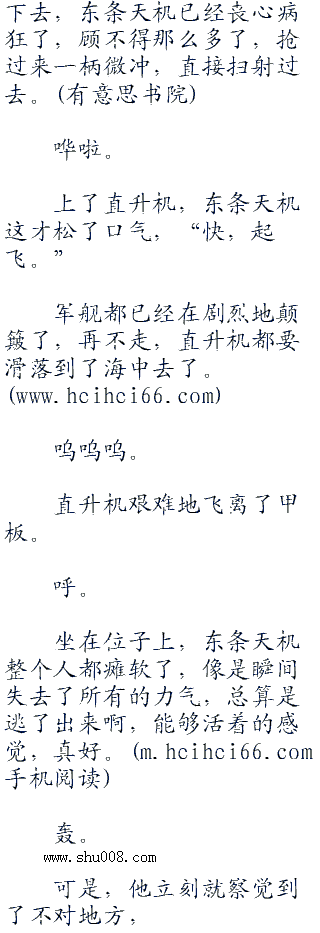 北海道号爱拓级驱逐舰上,东条天机整个人也快被吓疯了,遮天蔽日的海浪翻卷而来,舰队是逃不过的了,唯一的生路就是乘坐直升机上天,否则,具只能等死了。