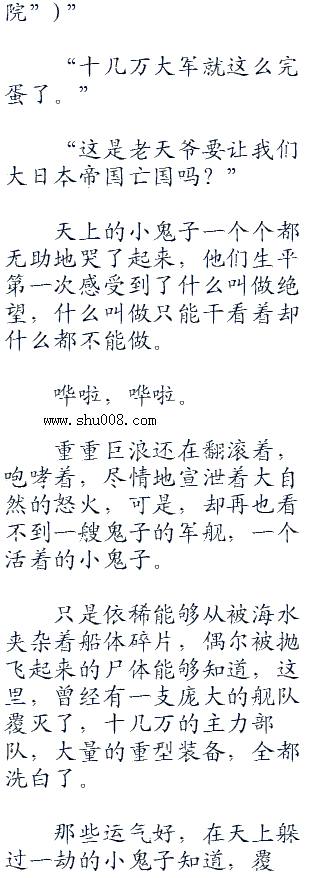 天下的鬼子战机呼啸着,那些小鬼子只能眼睁睁地看着,一艘艘武装渔船,武装货轮倾翻,被海水挤压成碎片,满船的小鬼子没有一个能够幸免。