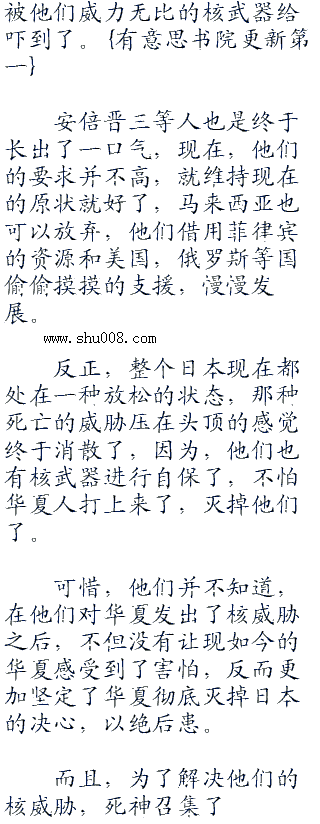所有人都没有任何的意外,毕竟,这个华夏的战神,外人眼中恐怖的死神是出了名的铁血,特别是对外的时候,鬼子敢用核弹威胁华夏,那么,这个死神就敢真的用氢弹将日本岛给炸沉。