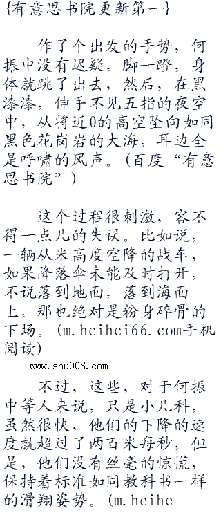 何振中身上穿着夜间作战服,xiong前悬挂着战术背包,特别是背上,背着一架造型颇为奇特的单兵滑翔器。