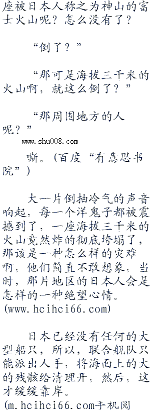 特别是,当他们看到外面被海啸,核弹冲击波破坏的一片狼藉的东京城,再看着那些街上的民众无助,惊恐的身形,这些小鬼子的心一片冰凉。。w ..co m