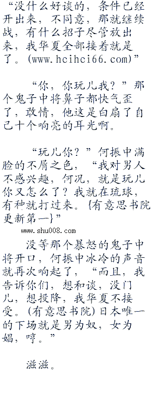 “我们日本还没输呢,只是不想双方这么继续打下去,造成生灵涂炭的下场。”那个鬼子底气不足地回了一句,接着,立刻就说道:“华夏到底要什么条件才肯停兵?”