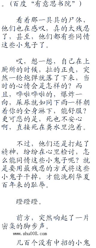 很多小鬼子没有拉裤子,战争的本能让他们纷纷朝着旁边跳过去,趴下,躲避从天而降的炮弹。顿时,哗啦,哗啦的声音响个不停,不少小鬼子直接就趴到了他们拉出来的粪水中,鼻息间全是那种恶臭味儿,很多人直接就想吐了。