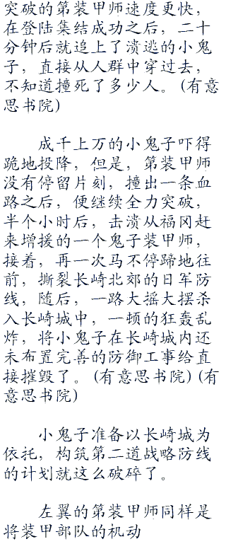 在登陆之后,装甲部队快速集结,组成了一道钢铁洪流,以不可抵挡之势,朝着溃败的鬼子追击而去。