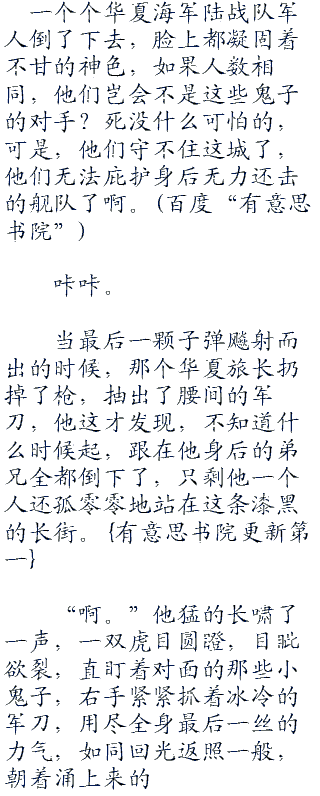 其他的华夏军人也在躲闪,跟在他们的旅长身后,抱着从鬼子手中夺过来的枪,就这么顶着暴风雨和子弹,发起了他们人生最后的一次冲锋。<div class="divimage"><div class="divimage"><div class="divimage"><div class="divimage"><div class="divimage">