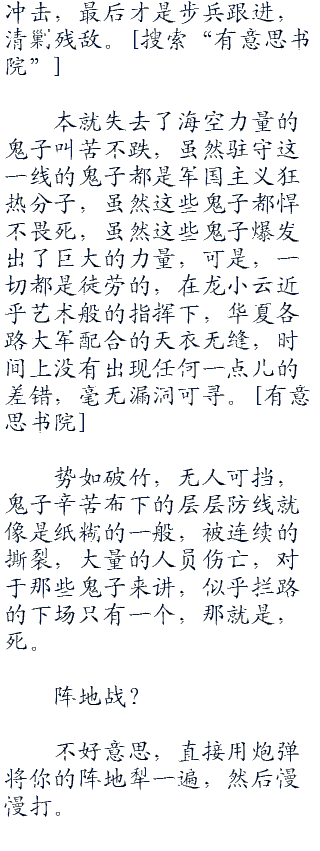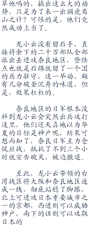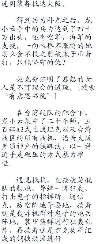 在成功从大阪方向登陆之后,龙小云带领的台湾战区就遭受到了鬼子的疯狂进攻,甚至,鬼子一度集结了超过百万的大军,从三个方向对华夏部队进行围攻,企图将华夏歼灭或者赶下海,但是均被华夏的空中火力优势和舰队的火力支援所击退。