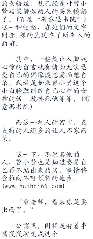在事情的真相还没有揭露的时候,一些偏激的女粉丝,就已经是对曾小贤与梁静如两人的关系愤怒了。这一种愤怒,在她们的文字间赤.裸的呈现在了所有人的面前。
