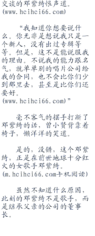 虽然不知道什么原因,此刻的邓紫绮不是歌手,而是继承父亲的公司的董事长。