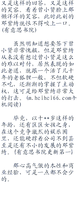 虽然明知道想要签下曾小贤非常愧赧,但是邓紫绮从来没有想过曾小贤是这么的难以对付,居然表现的如此老道,就跟一个活了几十年的老狐狸一般,不但软硬不吃,还渐渐的掌握了主动权,这可是给邓紫绮非常大的打击。