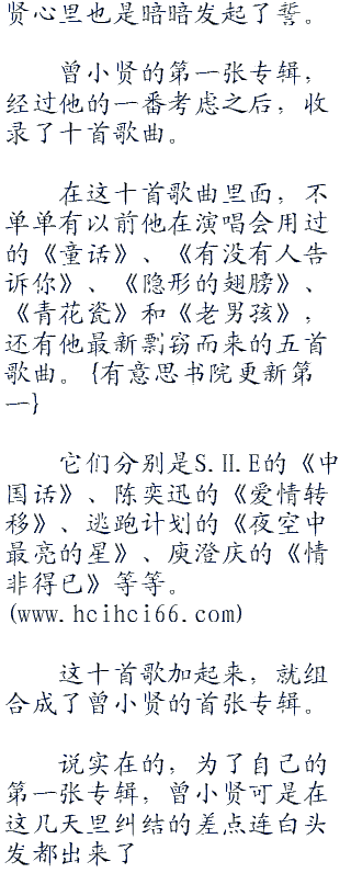 不过,对于这一些,曾小贤并不在乎,大杂烩就大杂烩吧,反正只要专辑里的歌曲能让歌迷喜欢就oK了。这就是曾小贤内心里的想法。