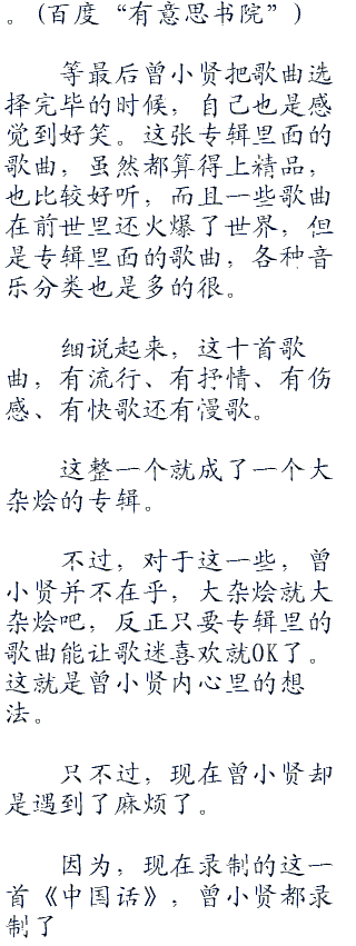 因为,现在录制的这一首《中国话》,曾小贤都录制了一个多小时了,效果依旧是难以让自己满意。