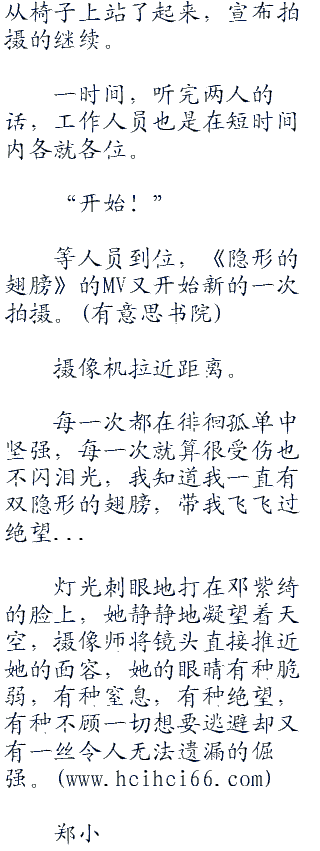 只见起身的邓紫绮大声说完这一番话之后,就大步来到《隐形的翅膀》这个mV的背景之前,水汪汪的大眼睛直视着郑小龍的方向。