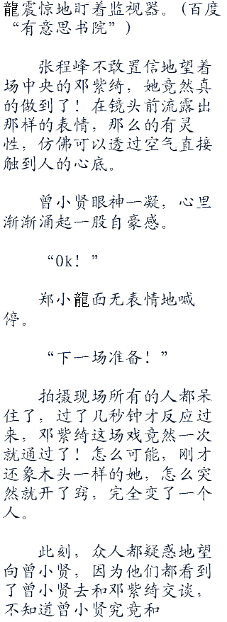 拍摄现场所有的人都呆住了,过了几秒钟才反应过来,邓紫绮这场戏竟然一次就通过了!怎么可能,刚才还象木头一样的她,怎么突然就开了窍,完全变了一个人。