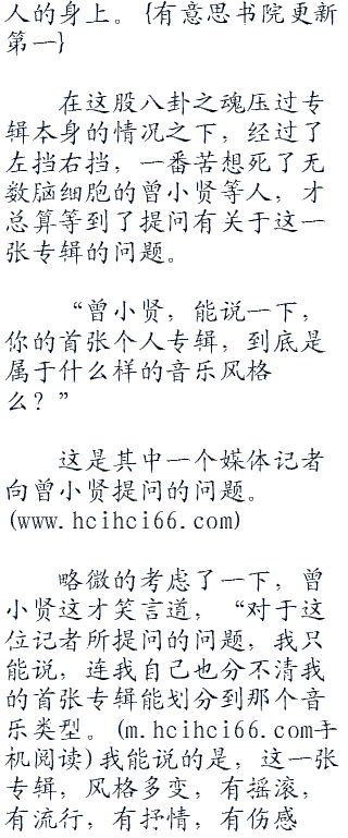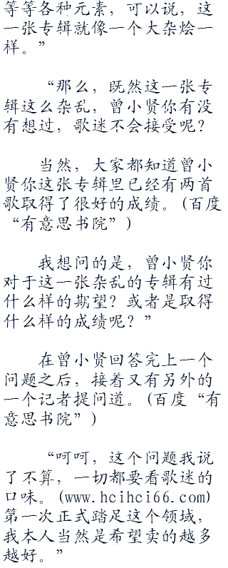 略微的考虑了一下,曾小贤这才笑言道,“对于这位记者所提问的问题,我只能说,连我自己也分不清我的首张专辑能划分到那个音乐类型。我能说的是,这一张专辑,风格多变,有摇滚,有流行,有抒情,有伤感等等各种元素,可以说,这一张专辑就像一个大杂烩一样。”