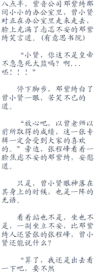 早上临近八点半,紫音公司邓紫绮那间小小的办公室里,曾小贤对正在办公室里走来走去,脸上充满了忐忑不安的邓紫绮笑言道。
