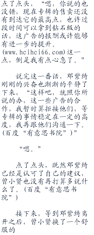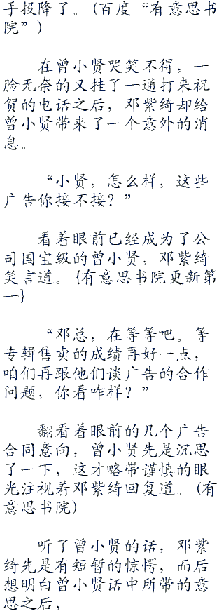 “邓总,在等等吧。等专辑售卖的成绩再好一点,咱们再跟他们谈广告的合作问题,你看咋样?”