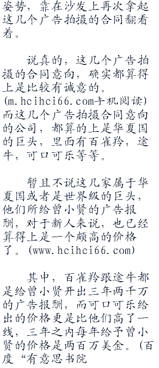 其中,百雀羚跟途牛都是给曾小贤开出三年两千万的广告报酬,而可口可乐给出的价格更是比他们高了一线,三年之内每年给予曾小贤的价格是两百万美金。