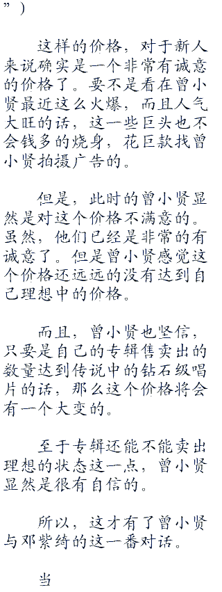 而且,曾小贤也坚信,只要是自己的专辑售卖出的数量达到传说中的钻石级唱片的话,那么这个价格将会有一个大变的。