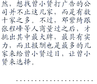 翻看着眼前的几个广告合同意向,曾小贤先是沉思了一下,这才略带谨慎的眼光注视着邓紫绮回复道。