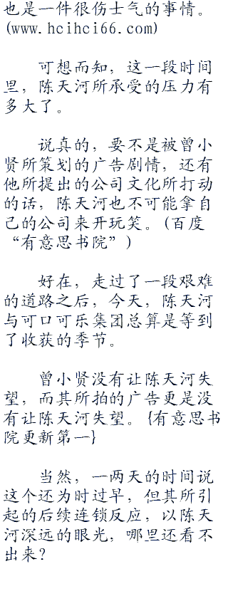 曾小贤没有让陈天河失望,而其所拍的广告更是没有让陈天河失望。
