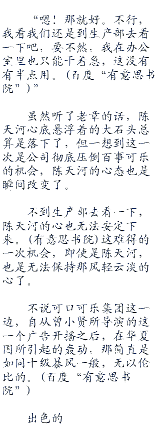 虽然听了老章的话,陈天河心底悬浮着的大石头总算是落下了,但一想到这一次是公司彻底压倒百事可乐的机会,陈天河的心态也是瞬间改变了。