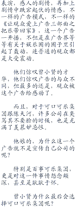 不说可口可乐集团这一边,自从曾小贤所导演的这一个广告开播之后,在华夏国所引起的轰动,那简直是如同十级暴风一般,无以伦比的。