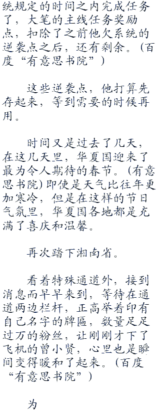 在这期间,值得一提的是,曾小贤在前几天去湘南电视台录制《快乐大本营》和《脱口秀》之后,昨天他正在研究歌曲的时候,脑海之中,突然响起了系统机械的声音,大意是通知他,已经完成了主线任务。