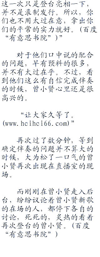 再次过了数分钟,等到确定伴奏的问题并不算大的时候,大为松了一口气的曾小贤再次出现在直播室的现场。