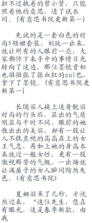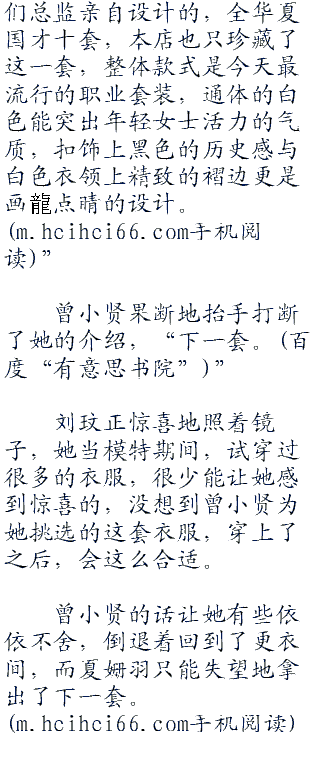 夏姗羽好心拿出一套老款样式,那是全店里面最便宜的,她怕曾小贤的钱不够,也不想让客人丢了面子,于是善解人意的推荐了一番。