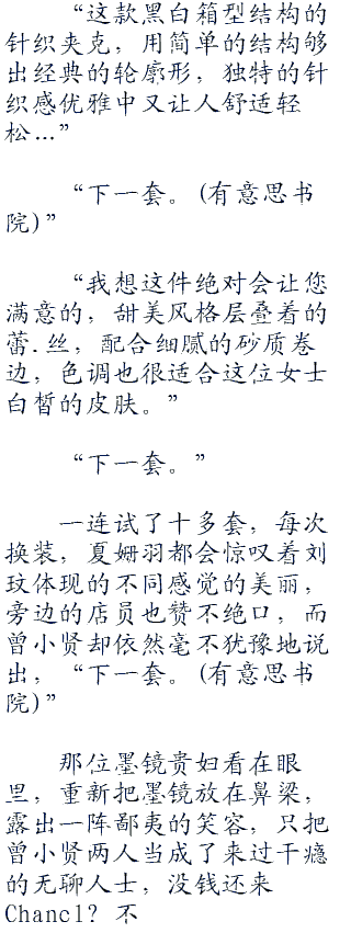 Chanel店的导购小姐,全是气质清新职业女性,这种奢侈店里一向就是以一群人服.务一个顾客为信念的,然而曾小贤进来后,却只有一位年纪很轻的导购小姐招呼他,而其他的人都围在另一位贵妇打扮的女人身边。看┷毛┷线┷小┷说