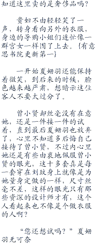 “您还想试吗?”夏姗羽无可奈何地看着曾小贤,旁边的其余的导购小姐已经开始同情夏姗羽了。