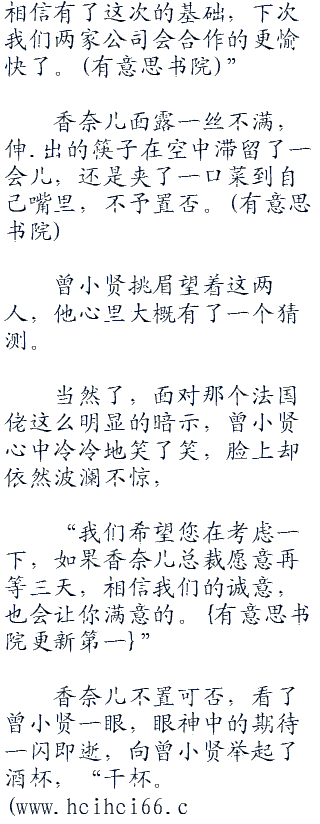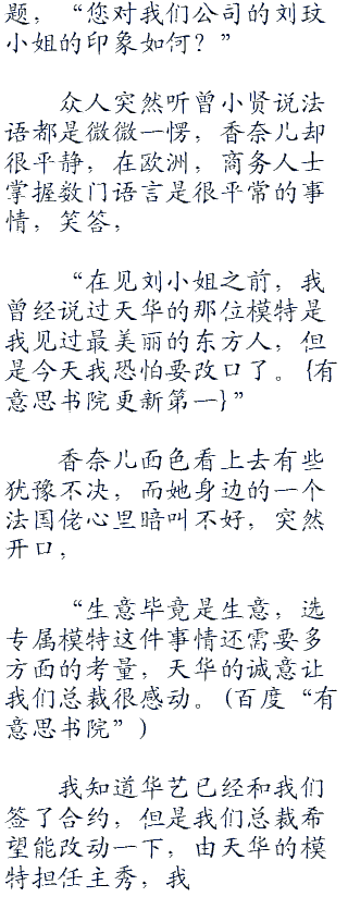 卡尔.拉格斐喝了一口水,用一种非常意味深长的语气说道,“如果曾先生一定要问个原因的话,我只能说天华的模特,要比你们华艺的更加用心。”