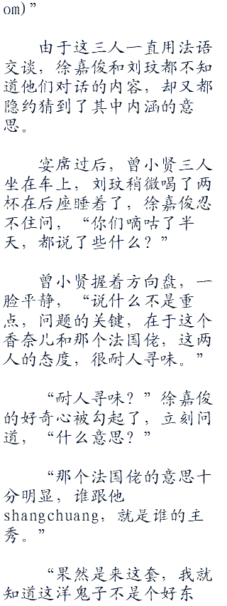 由于这三人一直用法语交谈,徐嘉俊和刘玟都不知道他们对话的内容,却又都隐约猜到了其中内涵的意思。