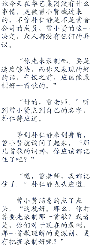她今天在华艺集团没有什么事情,是被曾小贤喊过来的,不管朴仁静是不是紫音公司的成员,曾小贤的这一决定,众人都没有任何的异议。