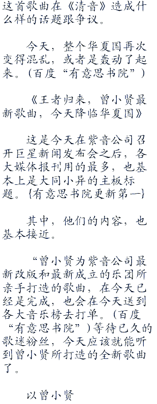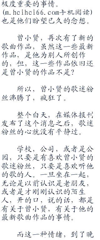 学校,公司,或者是公园,只要是有喜欢曾小贤的歌迷粉丝,只要是喜欢听他的歌的人。一旦坐在一起,无论是以前认识是老朋友,或者是才刚刚认识的陌生人,开的口,说的话,都是有关于曾小贤,有关于他的最新歌曲作品的事情。