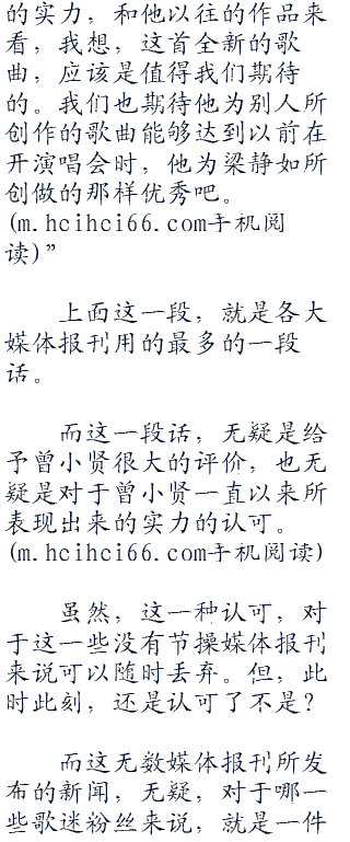 以曾小贤的实力,和他以往的作品来看,我想,这首全新的歌曲,应该是值得我们期待的。我们也期待他为别人所创作的歌曲能够达到以前在开演唱会时,他为梁静如所创做的那样优秀吧。”