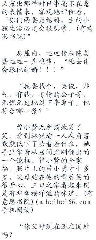 曾小贤无所谓地笑了笑,看到林宛瑜一人在角落默默低下了头看着什么,她手里拿着从房间里刚翻出的一个镜框,曾小贤的全家福,照片上的曾小贤才十多岁,父母站在他的背后笑的很开心,三口之家看起来倒是有些幸福洋溢的味道。