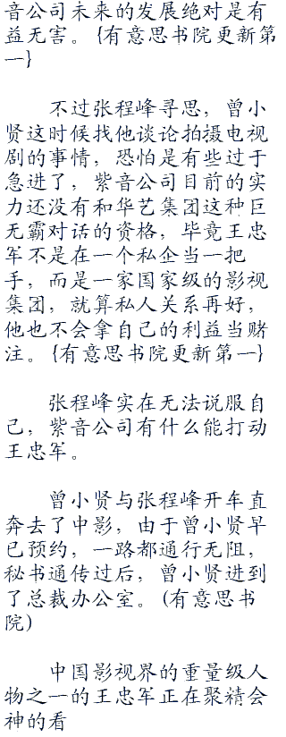 曾小贤口中的王忠军是现任华艺集团的董事长,早就听说他与曾小贤私交很好,具体的情况张程峰没有问过曾小贤,但有一点可以肯定,这位绝对是中国影视界重量级人物。
