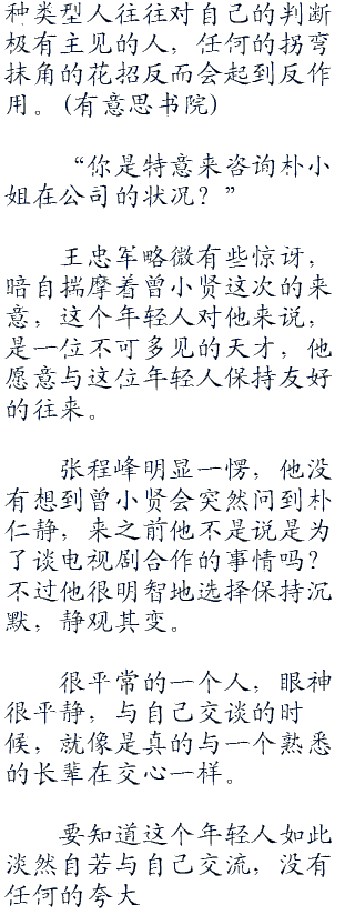 张程峰明显一愣,他没有想到曾小贤会突然问到朴仁静,来之前他不是说是为了谈电视剧合作的事情吗?不过他很明智地选择保持沉默,静观其变。
