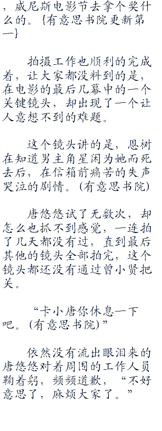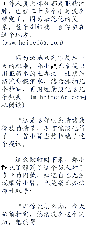 唐悠悠试了无数次,却怎么也抓不到感觉,一连拍了几天都没有过,直到最后其他的镜头全部拍完,这个镜头都还没有通过曾小贤把关。