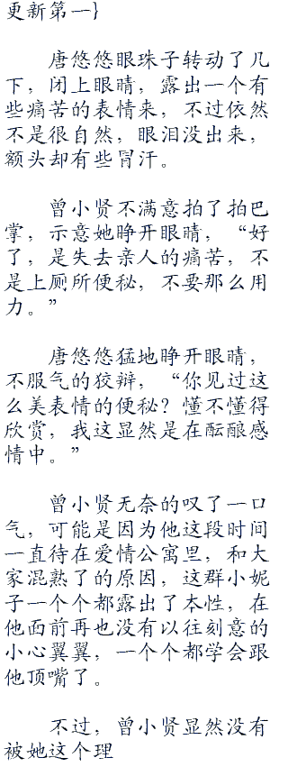 不过,曾小贤显然没有被她这个理由说服,“那敢问您现在酝酿好了没有,可以开始了吗?还是需要我帮你拿张厕纸来?”