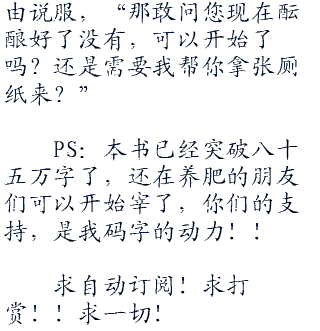 PS:本书已经突破八十五万字了,还在养肥的朋友们可以开始宰了,你们的支持,是我码字的动力!!